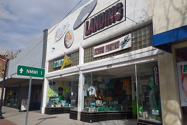 Arriving into Roswell, the first thing you notice are the street lamps adorning Main Street, giving the town an unearthly glow. Their bulbous globes glow green at night and have been painted with slanted alien eyes. Incredibly, this wasn’t an officially sanctioned project, but the vintage streetlamps were pimped up as a guerrilla art project about 20 years ago. The next thing you notice is the unseemly profusion of chintzy gift stores, dozens and dozens of them, milking the Roswell Incident, chock-full with tacky alien-emblazoned souvenirs and assorted paraphernalia. Alien Pate’ anyone? The “illegal alien” t-shirts are apparently the top-seller in town.