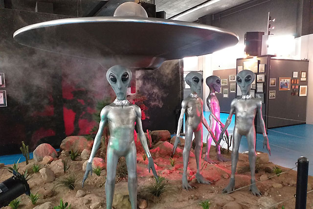 Much of the museum has a home-spun, unsophisticated feel, dominated by static displays of written reports, still photographs and newspaper clippings. But it’s surprisingly compelling, even though the museum is about to embark on a slick multi-media makeover. Then there’s the fun stuff, like the movie props from the 1994 film on Roswell, headlined by the prop alien corpse dummy, lying on a hospital gurney inside a glass-walled room. It was supposedly designed based on eye-witness accounts. Unleashing everyone’s inner-child is a fanciful animatronic display of a spaceship that takes off and lands, surrounded by gibbering aliens. It’s selfie-central.