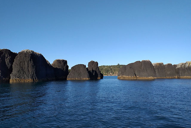 Nearby, Black Rocks. Formed from an ancient volcanic eruption, the lava flow’s whimsical basalt formations are an eye-catching oddity – similar to the Giant’s Causeway in Northern Ireland. It’s a wildly popular diving spot with an abundance of marine life inhabiting the crevices of the layered rock, deep down. In the summer months the rocks cook, heating up to 60C, which savvy birdlife exploit during the nesting season to incubate their eggs. We cruised by Marsden Cross, high above Rangihoua Bay, marking the place where Samuel Marsden held the nation’s first Christian sermon on Christmas Day 1814. Jurassic greywacke rock dominates the bay, a very soft rock where the power of the ocean has created a honeycomb of sea caves. An intimate encounter one of these caves entailed poking our nose into the evocatively-named Taniwha’s Den.