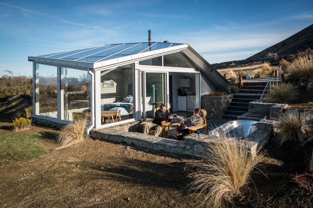 The glass-roofed bedroom is complemented by a grass-roofed kitchen and bathroom, effortlessly blending into the terrain. Outside, in a sunken courtyard, you can relax in a 2m long stainless steel-cedar bathtub. No chemicals are added – just pure heated water – sourced from a nearby spring. A gourmet continental breakfast is provided, including muesli, yoghurt, fresh fruit, bread, juice, tea and coffee. An evening dinner platter or salad is available on request. SkyScape is a celebration of the Mackenzie landscape, the beautiful sunrises, night sky and the priceless allure of wide open spaces and silence.