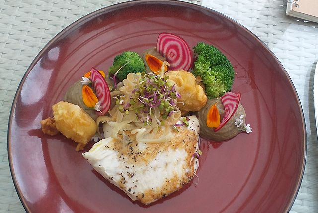 Local produce and ingredients are to the fore with many grown on-site in their organic garden, with plentiful herbs and seasonal vegetables. After grazing on the house baked bread and dips I enjoyed steamed green-lipped mussels, Tom Yum coconut sauce and garlic focaccia for my entrée. The pan-fried Snapper is a star selection from the Mains which is accompanied with battered scallops, fennel & ginger slaw, broccoli and eggplant puree.