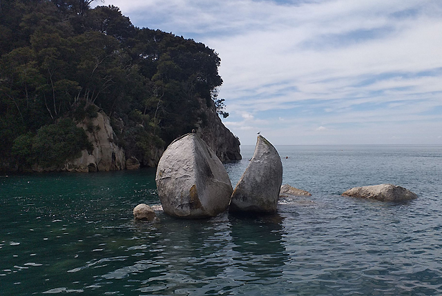 Purring out of Kaiteriteri, an early highlight is enjoying an intimate rendezvous with Split Apple Rock. The naturally occurring rock formation is estimated to be around 120 million years old. According to Māori legend, the boulder was split by two feuding gods who were fighting to possess it. To resolve the issue, they used their huge godlike strength to break it in half. As such, the Māori name for the rock is Tokangawhā, which means “burst open rock.” A more scientific theory is that water seeped into a crevice in the rock and then froze during an ice age, expanding and thus splitting the stone apart. Either way, it’s insta-gold. We passed by Adele Island, a flourishing wildlife sanctuary, where the chorus of birdsong rings from the treetops.