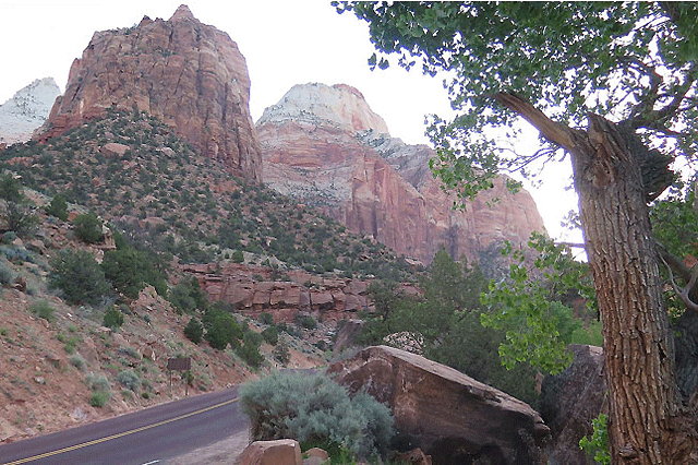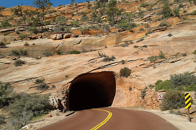 I entered the park from its eastern approach, on the famed Zion-Mount Carmel Highway, punctuated by a one-mile long tunnel, blasted out of solid sandstone. The three year guts and glory project was finally completed in 1930, and hailed across America as an engineering miracle. 800 feet high, a sequence of open air “galleries” were built into the side of the tunnel, which early sightseers would stop at, to gasp at the elevated alpine vista across the national park.