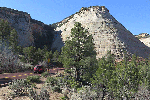 The walk is a one-hour round journey, but worth every step. Driving into the national park, I was suddenly confronted by Checkerboard Mesa, a stirring specimen of naturally sculpted rock art – and so aptly named. I soon learnt that the checkerboard design of this Navajo sandstone dome indicates that ancient sand dunes created the horizontal lines and the vertical fractures have been enlarged by rain and snowmelt runoff. (Mesa is the American term for tableland.) It’s a compelling landmark.