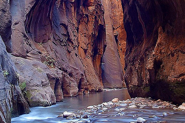 This wonderland of geologic time, bathed in a mosaic of colour, is characterised by red and white sandstone monoliths, rock towers and mesas. In addition to Zion Canyon, which is still carved and sculpted by the Virgin River, there’s a honeycomb of deep and narrow slot canyons. The Virgin River was barely tinkling, on my visit. But it can swiftly and dramatically turn into a raging gusher, given the area’s propensity for flash floods following summer monsoon downpours.