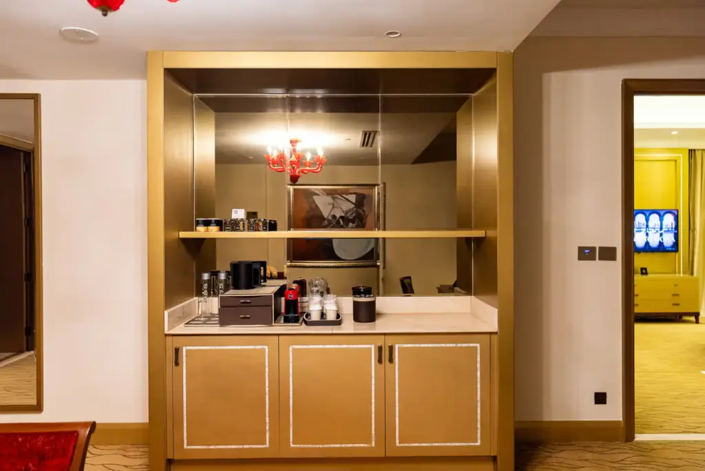 For those rare moments when relaxation must share space with responsibility, a handsome teak work desk provides a dignified setting for private meetings or focused planning. The living room, meanwhile, offers generous proportions and adaptable lighting, creating a natural stage for evening entertainment or quiet reflection with equal ease. The in-suite dining option elevates private entertaining to an art form. The hotel’s culinary team can craft everything from refined hors d’oeuvres to complete multi-course dinners, delivered with restaurant-quality presentation and the intimacy of your own residence.