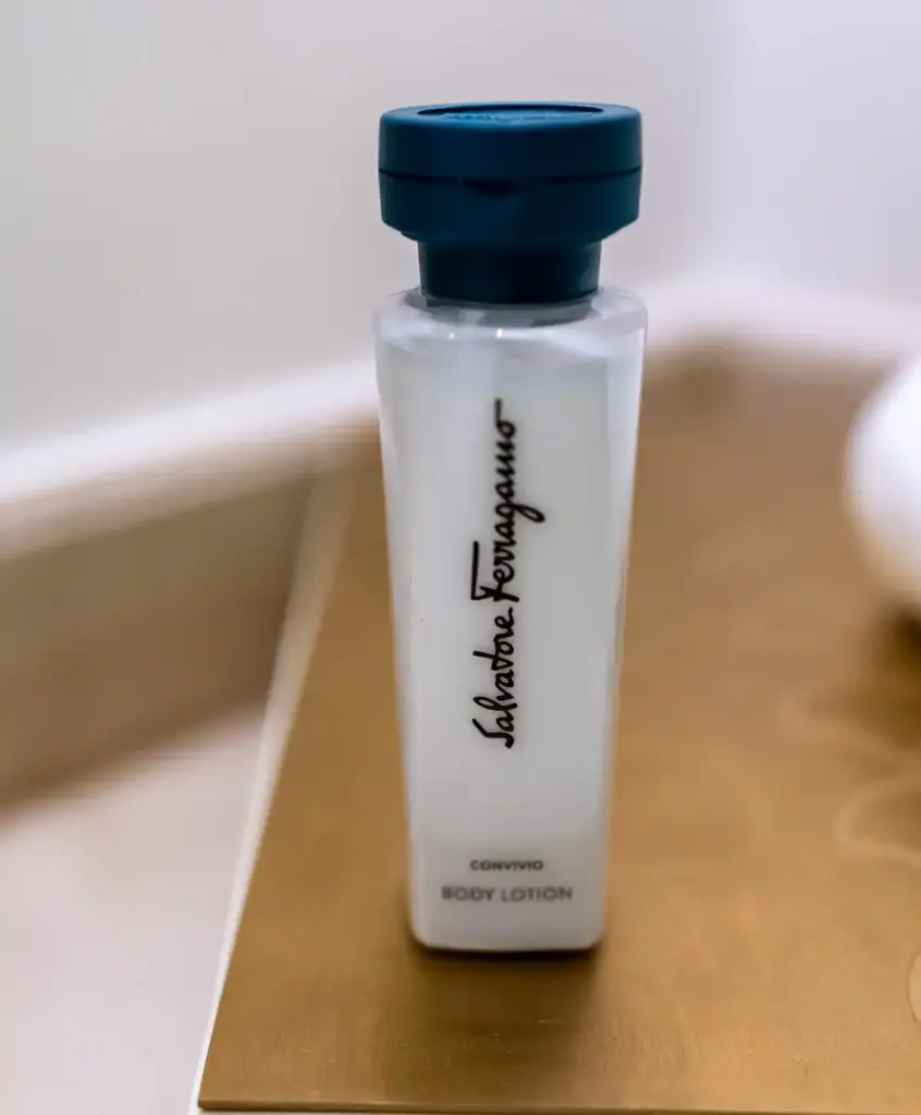 The bathroom delivers indulgence through Salvatore Ferragamo toiletries, a generous walk-in shower, and a deep bathtub perfect for unhurried soaking.