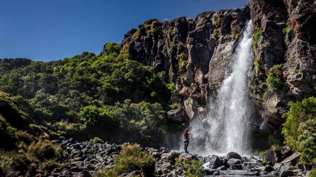 Close to Chateau Tongariro, there’s a stack of tasty wee tracks. The Tawhai Falls walk is a heart-stealer, leading you through mountain toatoa and beech forest to a waterfall tumbling over the edge of an ancient lava flow. It’s one of two waterfalls used in Lord of the Rings that depicted Gollum fishing, hence its nickname is Gollum’s Pool. (Mangawhero Falls, very close to Waitonga Falls, is the other cascade used as a location for Gollum fishing.)