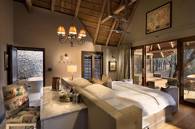 The large swimming pool was ingeniously developed to overlook the neighbouring and highly-trafficked waterhole, so you’ll never know just whom you will be having a splash and soak with! Accommodations are seraphic: 20 luxurious thatched cottages which includes three family cottages, shaded by mopane trees and affording wilderness views. The family suite also includes a private swimming pool and the use of a private safari vehicle. My heavenly abode boasted arctic-cool air conditioning, a private verandah, an en suite bathroom with separate indoor shower as well as an outdoor rain shower.