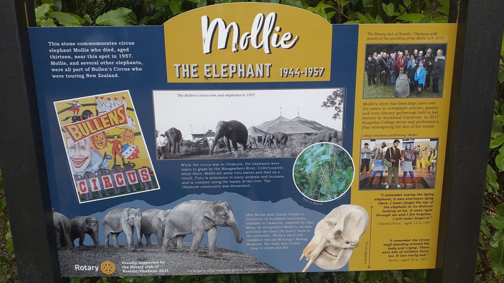 Adjacent to the track entrance is Mollie’s Rock, a memorial rock in honour of the Asian elephant who is buried here, under the road. Yes, you read that correctly! The rock has just been joined by an information board tracing the tragic story of Mollie the circus elephant, who died in Ohakune in 1957. Mollie was a young elephant touring New Zealand with the Bullen Brother’s circus company – a star of the big ring. Her handlers took her down to the banks of the Mangawhero River to exercise and graze. Tragically, Mollie consumed some toxic tutu berries in the bush and passed away.