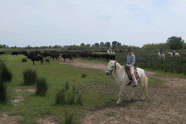 Gilbert previously competed in professional rodeos all over Europe as a bull rider, but now he rears wild Camargue black bulls, distinguished by their lyre-shaped horns. The finest specimens compete in the traditional French sport of course camarguaise, a much more humane and bloodless version of the Spanish bullfight. The contest entails plucking red rosettes from between their horns with a small hook.
