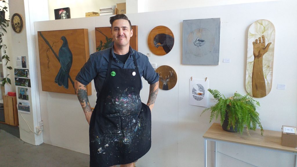 Joe’s love of New Zealand native birds is ever present in the studio, which he paints in lush, photo realistic detail. He’s synonymous with the hot-selling adults colouring book of native birds. He’s recently been in my neighbourhood in Christchurch, painting a commissioned mural for some friends in their family home.