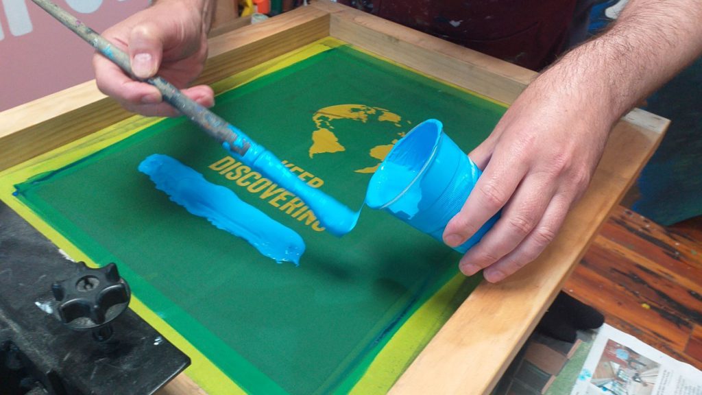 I then headed to Joe McMenamin’s wonderful art studio in the heart of Feilding, ready to fire up my creative juices. Joe was previously known as Mr Mac in his art teaching years, before stepping away from being a high school teacher to become a full-time artist. His abiding love for organic, flowing patterns, diving into painting, drawing, and making a beautiful mess with dyes and printmaking runs deep. I was joining Joe for a hands-on session screen-printing my own t-shirt.