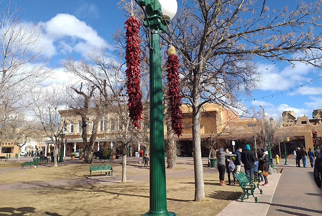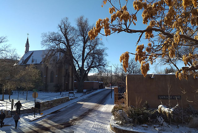 Just beyond town, a plethora of ancient Native American sites are in easy reach – when it’s not snowing. In northern New Mexico’s high desert and bounded by the Sangre de Cristo Mountains, Taos is acclaimed for its ancient multi-story adobe buildings. But the road was closed, due to the snow. Instead I headed south to Bandelier National Monument to ogle the ancient cliff dwellings and petroglyphs, that reach back thousands of years, within the scenic grandeur of the sheer-walled canyons or mesas. You can enter the cliff dwellings by climbing a series of wooden ladders, adding to the intrigue and sense of adventure, as you marvel over the rock paintings. The mystique burns bright in New Mexico.