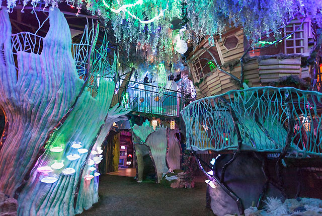 The storytelling is in your hands, depending on how you experience the house. Donning your 3D glasses, you have to decide if you will go into a deceptively innocuous-looking sitting room, up a set of stairs or into the living room fireplace. Yes, inside it. The house is like a living, breathing choose-your-own adventure – you never know what will be down those rabbit holes or inside the fridge door. Behind each hidden door is another room more fabulous and magical than the first. There are lots of places to sit and absorb – whether that be in the trunk of a giant tree or inside a neon-lined, Dutch-inspired windmill. There are treehouses to climb, washing machines to crawl inside of and toilets to look into.