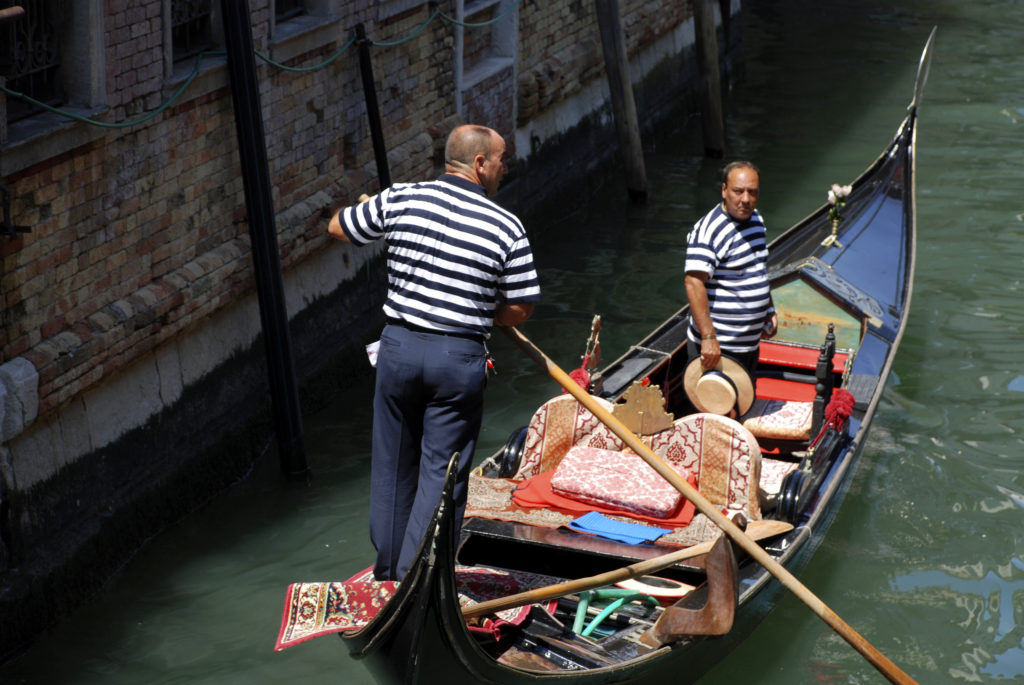 In the morning, I’m on the streets by 7:30, knocking back cappuccino at a pavement café. Early morning Venice is tatty and beautiful, its decay more apparent in the cold morning light – rubbish bins overflowing onto the streets, the canals chugging with service-boats. Rotting wooden stumps and blue-and-white-striped poles bristle from the water. I linger on a narrow landing stage and watch stout barges roaring past laden with supplies. Workmen stand on each one, sternly shepherding their cargo. They’re bringing all the day’s unglamorous goods into the city – crates of food, cases of beer, plastic items for shops. Salty, workaday Venice is starting its day. Here are the stage managers and prop assistants; here are the scene-shifters behind the mirage.